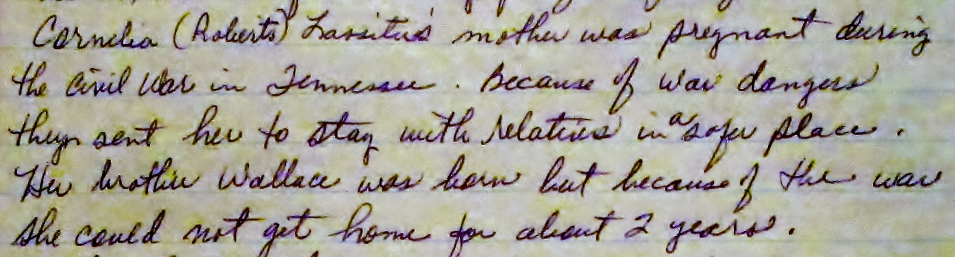 In 1852 John married Lavina Jane Wallace in Maury County, TN just southwest of Williamson.[viii]   On July 21, 1853 they welcomed their daughter Cornelia Ann Roberts into their lives and onto the farm.[ix]  She would spend the first years of her life under the tutelage of her mother and grandmother Rebecca Ann Roberts.   In fact, she would enjoy and benefit from these two influential women for many years, never living far from her mother’s companionship until Lavina’s death.