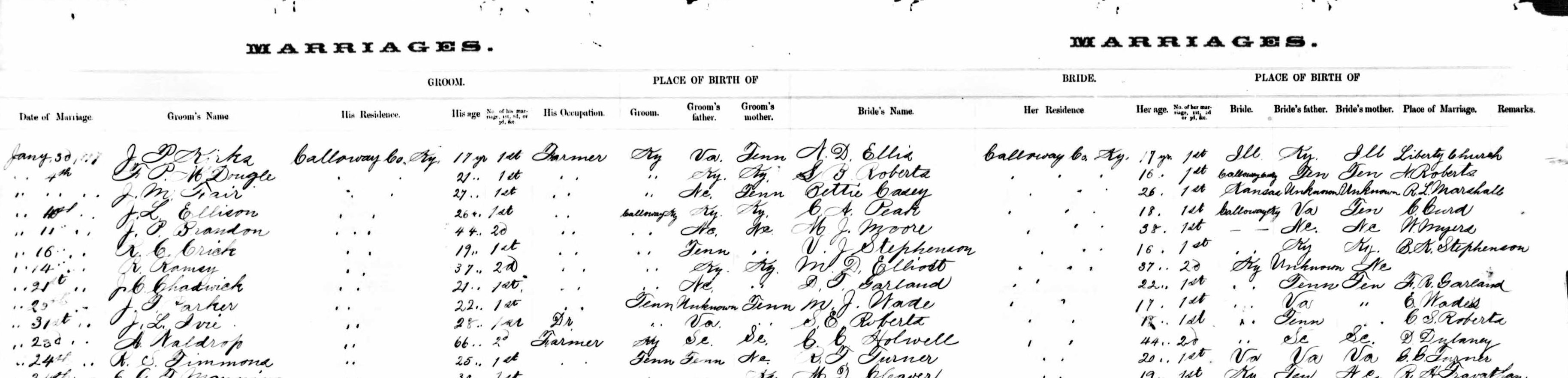 Calloway County, KY Marriage Record Source Information Ancestry.com. Kentucky, Marriage Records, 1852-1914 [database on-line]. Provo, UT, USA: Ancestry.com Operations Inc, 2007. Original data: Kentucky. Kentucky Birth, Marriage and Death Records – Microfilm (1852-1910). Microfilm rolls #994027-994058. Kentucky Department for Libraries and Archives, Frankfort, Kentucky.
