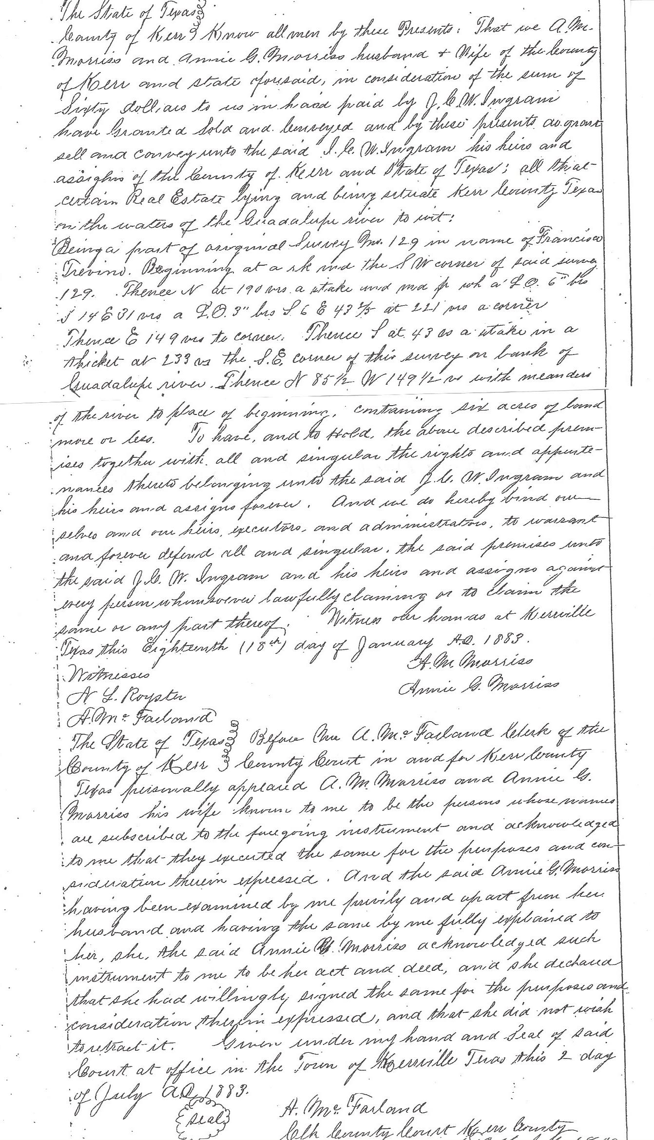 - Deed records copied from the courthouse records in Kerrville, Texas in May of 2013 tell us J.C.W. Ingram bought lots from C.E. Mitzschke in Kerrville in February of 1882 (Vol G p. 71). This is not the land he will later purchase west of town. The land he purchased from the Morriss family on which he built his store and ran his post office on the Guadalupe River was purchased in January 1883 (Vol H pp 8, 9).