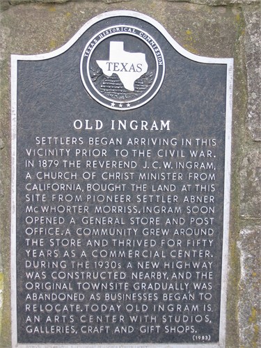 “INGRAM, TEXAS. Ingram is on Highway 27 and the Guadalupe River at the confluence of Johnson and Indian creeks, seven miles west of Kerrville in central Kerr County. The surrounding land was granted by the state to John Twohig in 1847. J. C. W. Ingram bought six acres in 1879, opened a store and post office, and gave the town its name.” (From Texas History Online as of August 13, 2015, https://tshaonline.org/handbook/online/articles/hli06 )